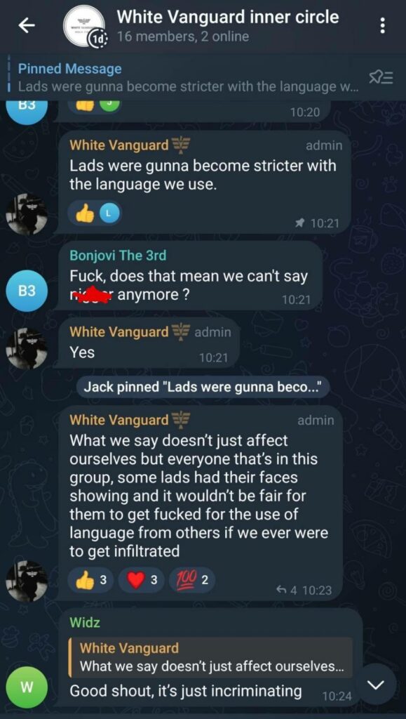 Members would also obsess over one the of the younger women inside the National Rebirth Party. Despite the strong talk from White Vanguard about “degeneracy” and returning to traditional family values, this obsessive behaviour often reached the stages of online stalking.