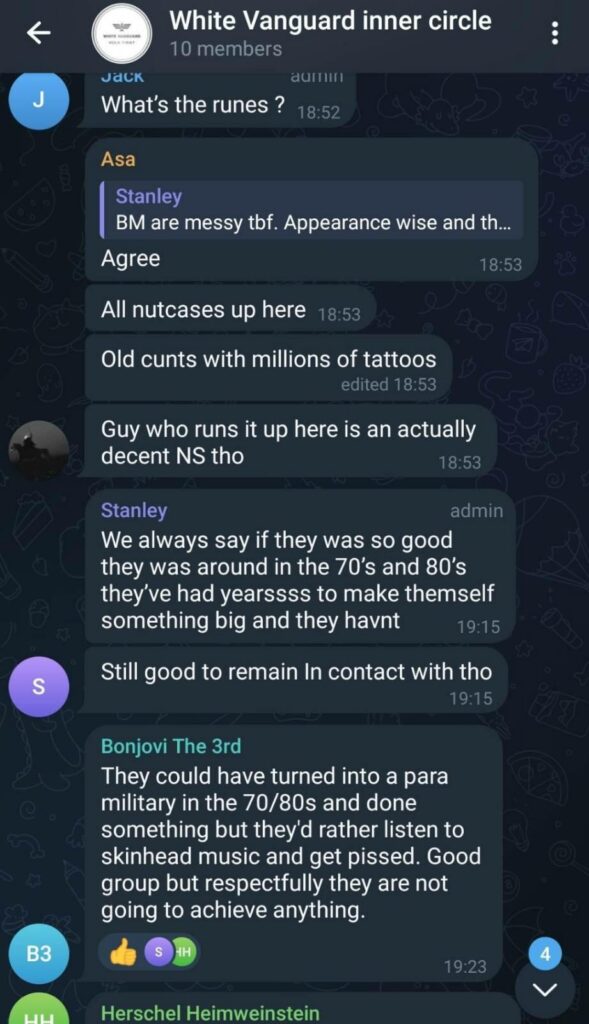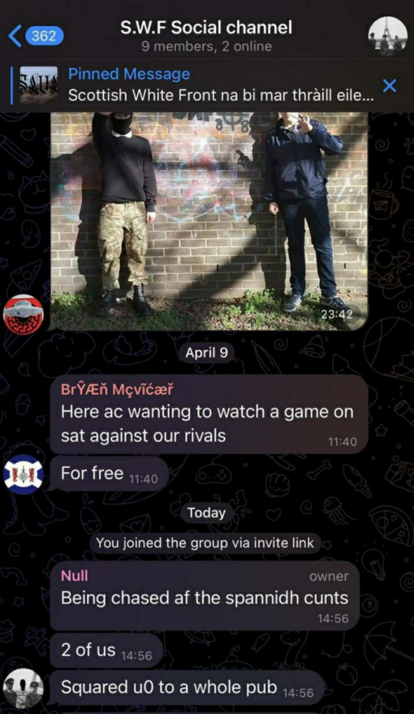 A couple of White Vanguard members are also part of the Scottish White Front. They are a small nazi accelerationist group primarily made up of young skinheads mainly based around Glasgow.