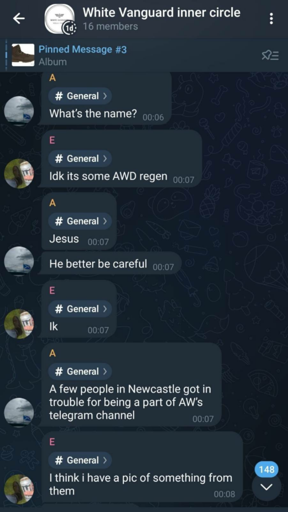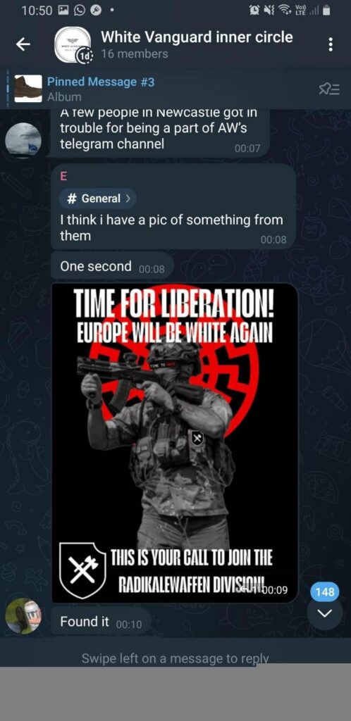 After these connections, linking up with active terror groups wasn’t far behind. A friend of one of the White Vanguard activists joined the Radikalewaffen Division. Though not yet a proscribed group, the group takes from the tendency that The Base and the Atomwaffen Division spawned.