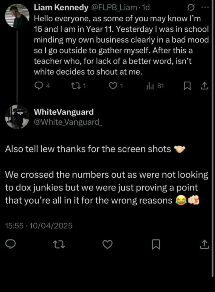 The other was a member of the London branch that White Vanguard took great pleasure in bullying and targeting over a period of months. No action appears to have been taken by the National Rebirth Party, or White Vanguard, to target or criticise the members that sit within both organisations so far.