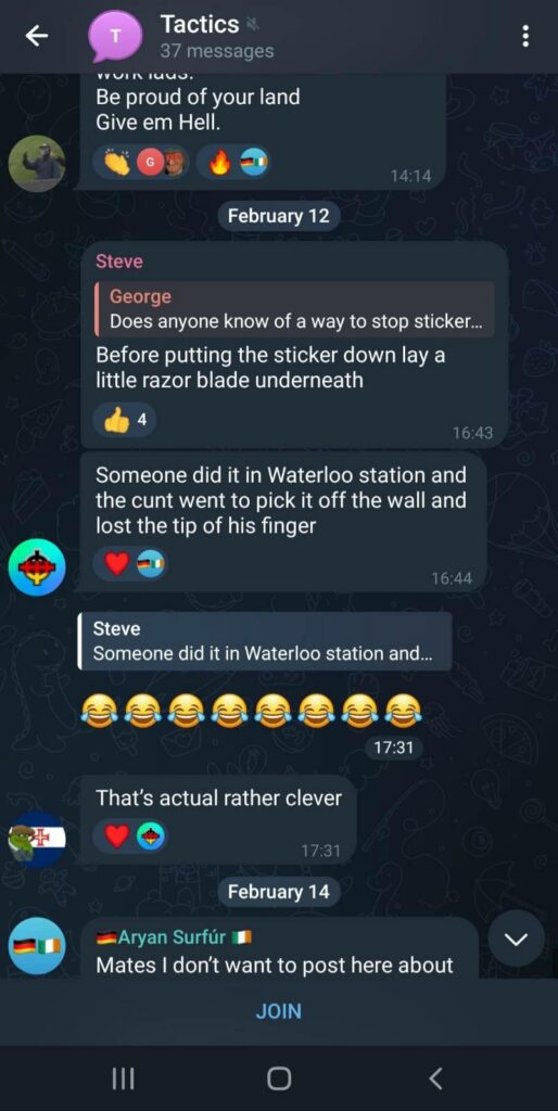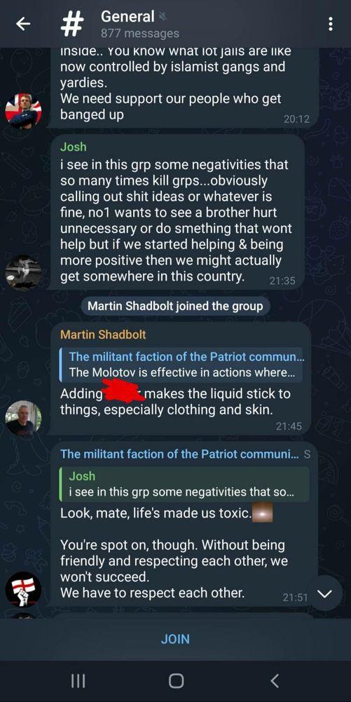 Also in this chat was Martin Shadbolt. Martin is a former National Front member, now involved with the British Movement and New British Union. Based in Putney, Martin is skilled in archery and an ex British Armed forces soldier. Martin advised the chat on how make Molotov cocktails more effective.