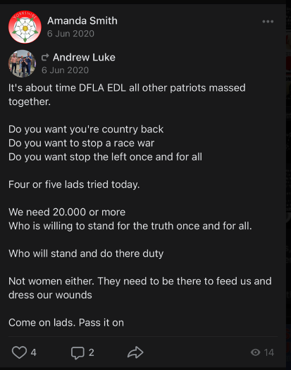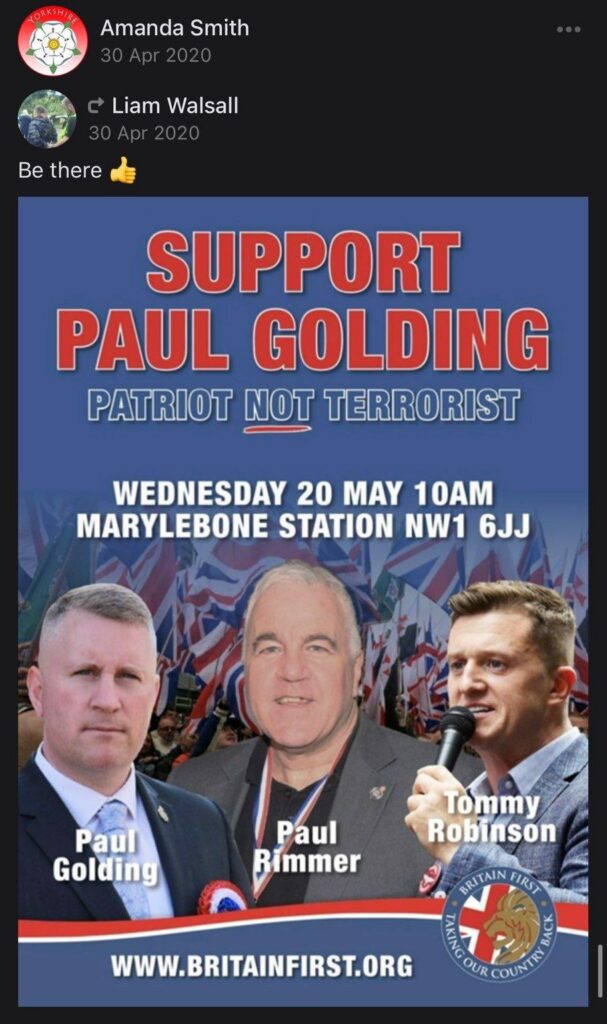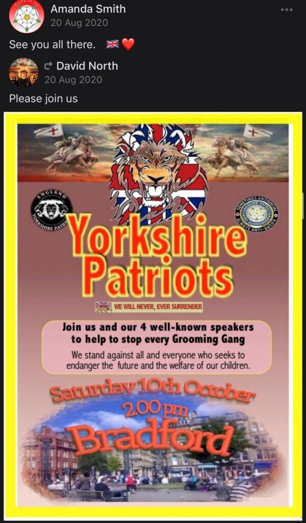 Amanda Smith (not to be confused with the racist National Front dinnerlady of the same name from Kent), has a history of organising within the far right — including with the EDL, the Yellow-Vesters, Britain First, and with the Yorkshire Patriots. Amanda, who is 48 years old and lives in Castleford (Wakefield) was also a key activist in the ‘Free Melanie Shaw’ campaign.