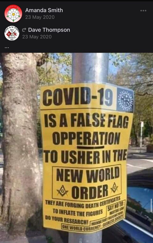 Nick also regularly posts pro-Trump content online, as well as Q Anon and ‘New World Order’ inspired conspiracies. He also appears to be a Covid-19 hoaxer and a anti-vaxxer, and regularly attends protests promoting the ‘Great Reset’.