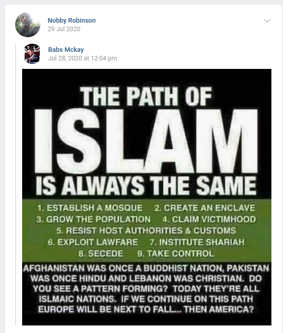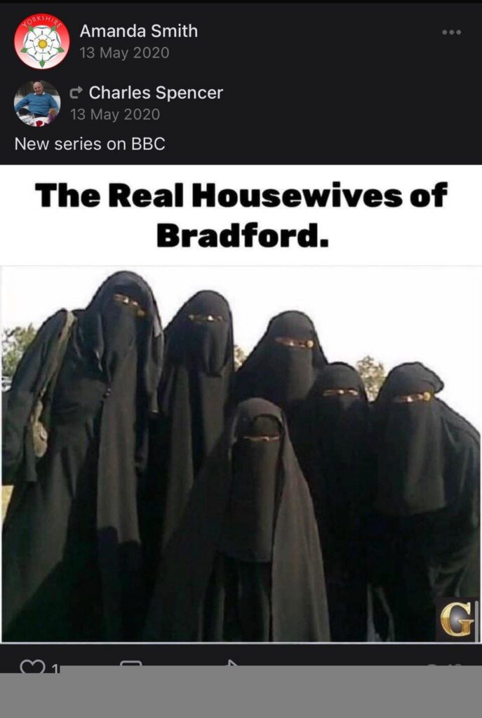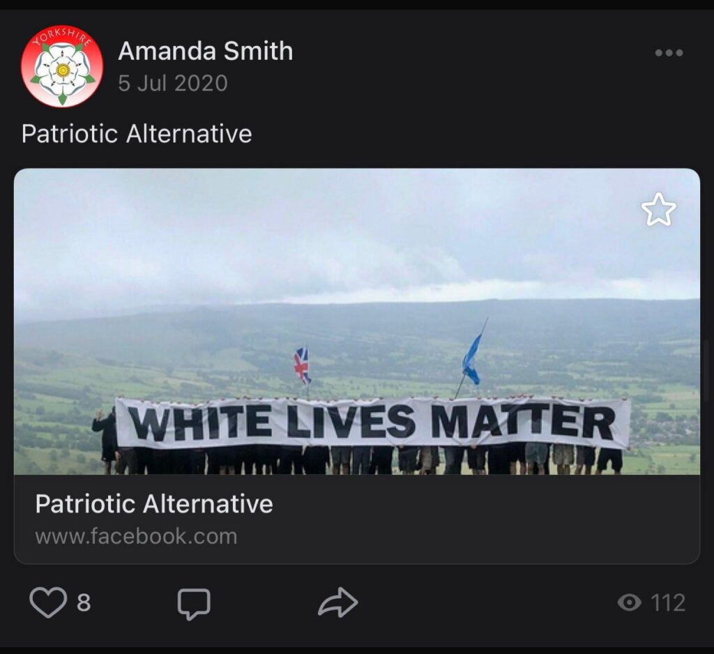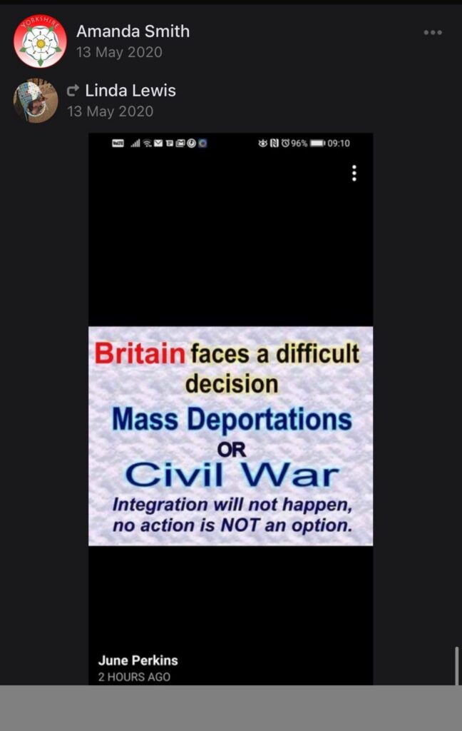Amanda is a vocal Tommy Robinson and Britain First supporter. She is rampantly Islamophobic and refers to Muslims as “m*zzies” on her social media. She has shared content describing asylum seekers as “filthy animals […] bringing their diseases with them” and has herself written “these individuals just don’t have the same morals as us”. She has also demonstrated a clear issue with non-white skin in general, pointing out the skin colour of people she crosses as a way to ‘other’ them.