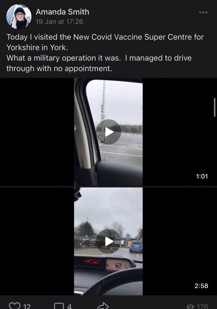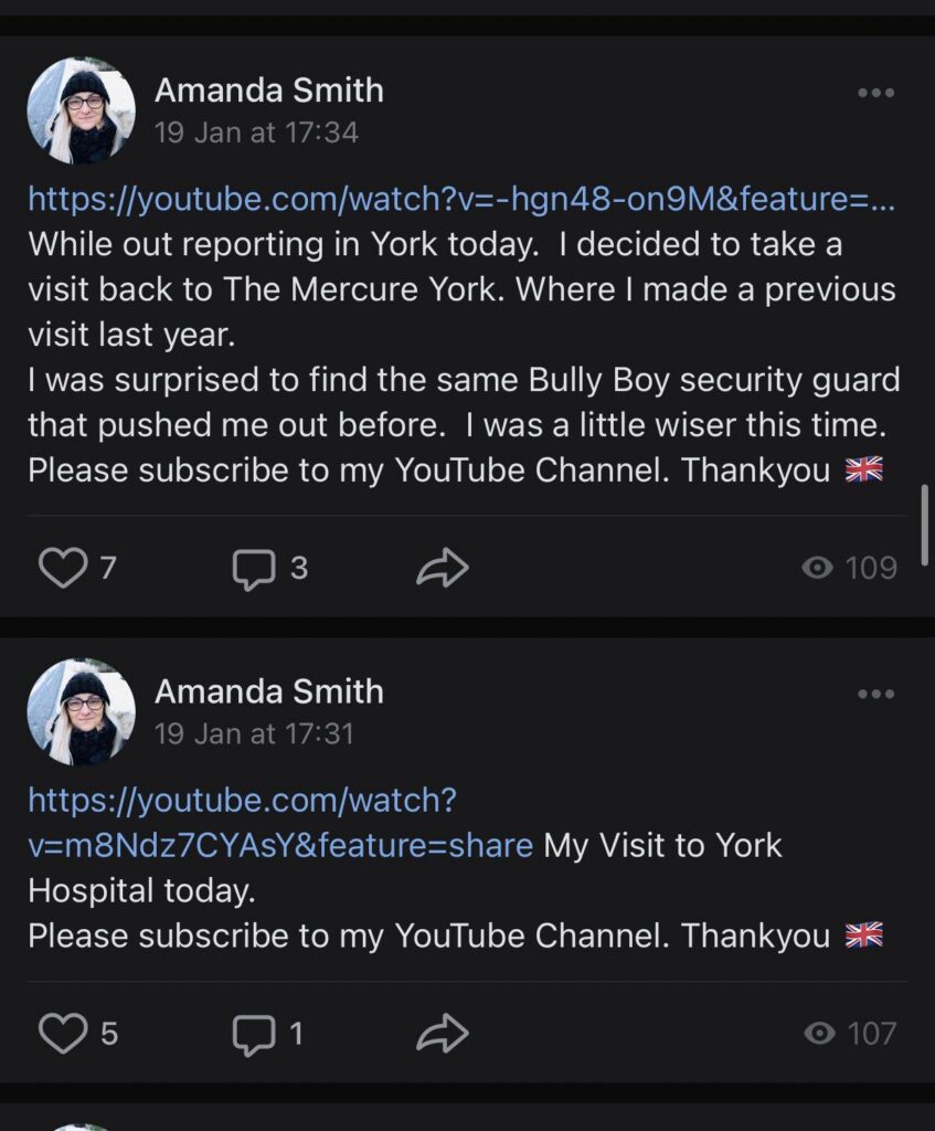 Amanda has recently turned ‘citizen journalist’. She has regularly posted footage of herself on social media and more recently, on her YouTube channel as “Yorkshire Rose”. Her videos often feature her and various accomplices loitering around outside hotel venues she suspects to be used for temporary accommodation, to harass staff and anybody she believes to be an asylum seeker. Her harassment at the hotels in January 2021 with Active Patriot led to both of their arrests for causing alarm and distress, and she claims they are banned from North Yorkshire as part of their bail conditions.
