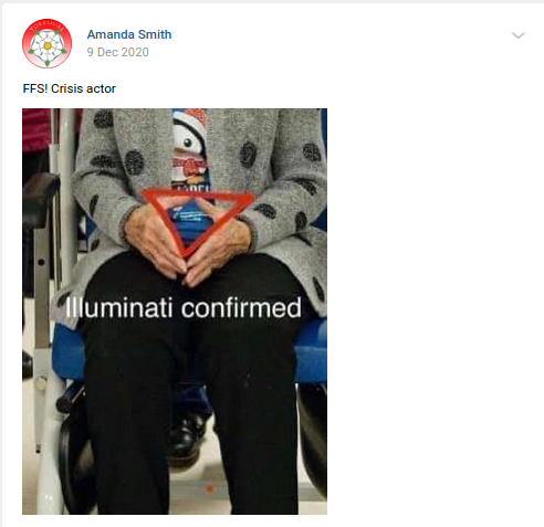 She has also recently been harassing staff at Covid-19 test centres and entering hospitals during the pandemic, and claims that Covid-19 is a hoax. In December 2020, she claimed that the first person to have the vaccine in the UK is a crisis actor.