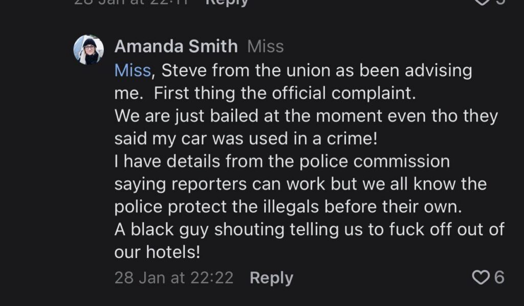 When Tracey went to walk another way to find another place to film them and came back to the entrance, she walked past several of the residents still holding her camera up at their faces. A confrontation ensued where one man, clearly upset, said to her “stop shooting me”, “don’t shoot me”, and reached to take her phone from her hand. Tracey is heard on the stream shouting “get them under control”, “you should be keeping an eye on these people”, “see this is what we’ve got coming into this country” and “he needs to be sent back”.