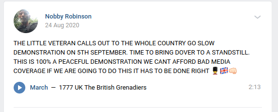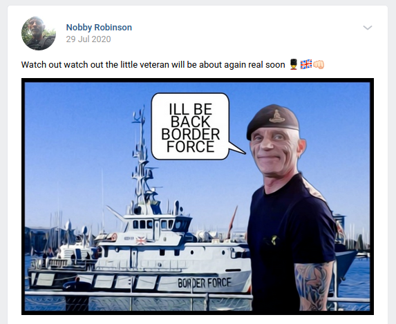 In September 2020, he was arrested for his part in a failure of an anti-migrant demo in Dover, and subsequently banned from Kent. After turning his attention to the barracks where asylum seekers are temporarily housed, he was promptly nicked while in Wales and banned from going within a mile of any army barracks in the UK as part of his bail conditions.
