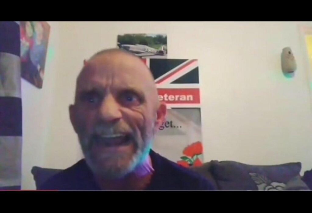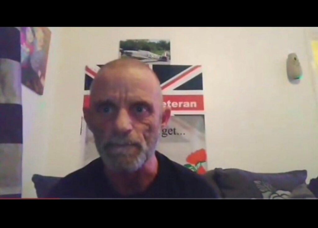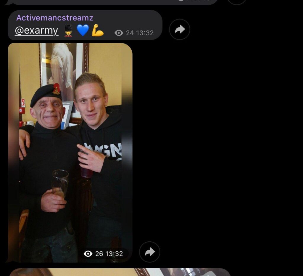 He was first observed on the scene in 2019, taking part in pro-Brexit and Soldier A-Z protests as part of ‘Never Surrender’ with famous ‘Walter Mitty bloater’ Dean Cumberpatch, as well as Tommy Robinson demos. Even then, his entire character revolved around his veteran status – he even used the Telegram username ‘@exarmy’ and was regularly seen in group chats discussing “us veterans” and appealing for “boots on the ground” at far right protests.