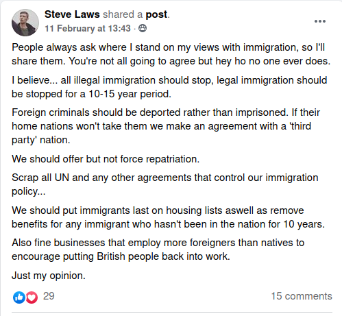 In January 2021 on the Horus stream, Steve claimed to not support any political parties at all, so appears to have rescinded his support and intended candidacy with For Britain. As explained above, he seems to have closely allied with neo-Nazis in Patriotic Alternative. His excuse for standing with literal Hitler worshippers is that the ‘movement’ will do better if everybody finds common ground and says that as long as they want to end immigration he ‘doesn’t care with who’. This is indicative of, at best, an incredibly dangerous apathy toward neo-Nazis on Steve’s part, particularly when he is appealing to others on the right to find shared perspectives with them. Steve’s rhetoric is the type that acts as a gateway for civic nationalists to be recruited into more extreme right groups.