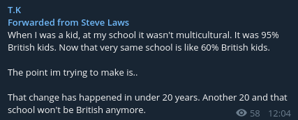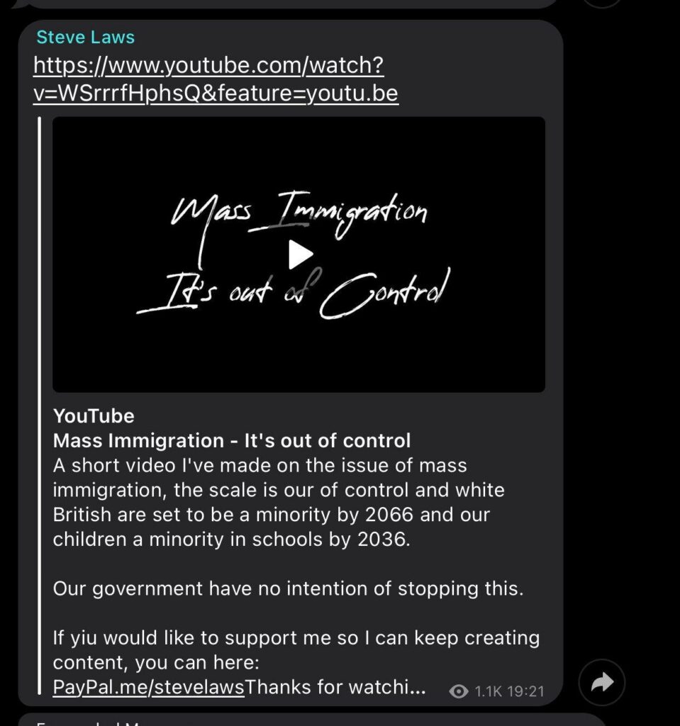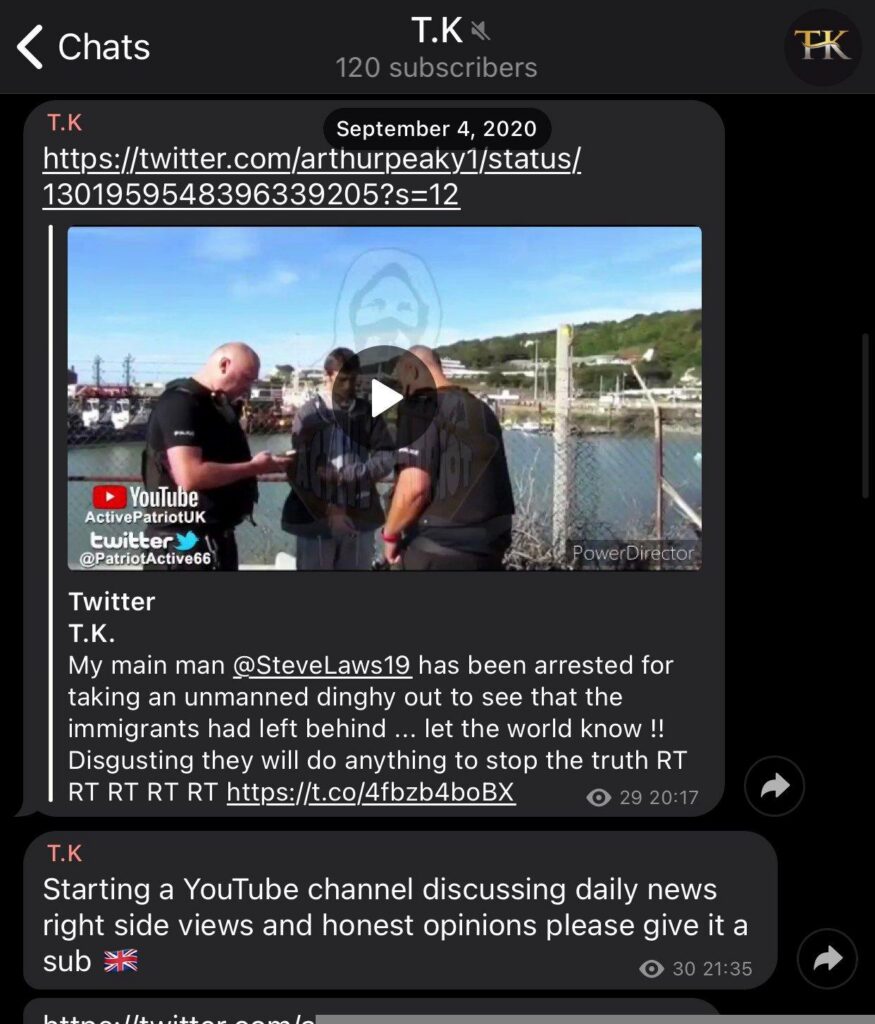 Like Active Patriot, Steve Laws has featured on livestreams with neo-Nazi Patriotic Alternative supporters Horus and Bonnie Lad, and admits that he agrees with “90%” of their views. Additionally, in September 2020 he also gave an interview to ‘T K’, a neo-Nazi affiliated with The Reality Report, who endorse Patriotic Alternative. While ‘T K’ never published the interview, he advertised it on his YouTube and Telegram. He also referred to Steve as “my main man” on Twitter. At this time, Steve’s mate T K was openly posts racial slurs and derogatory memes regarding black people and Jews, as well as praising Adolf Hitler.