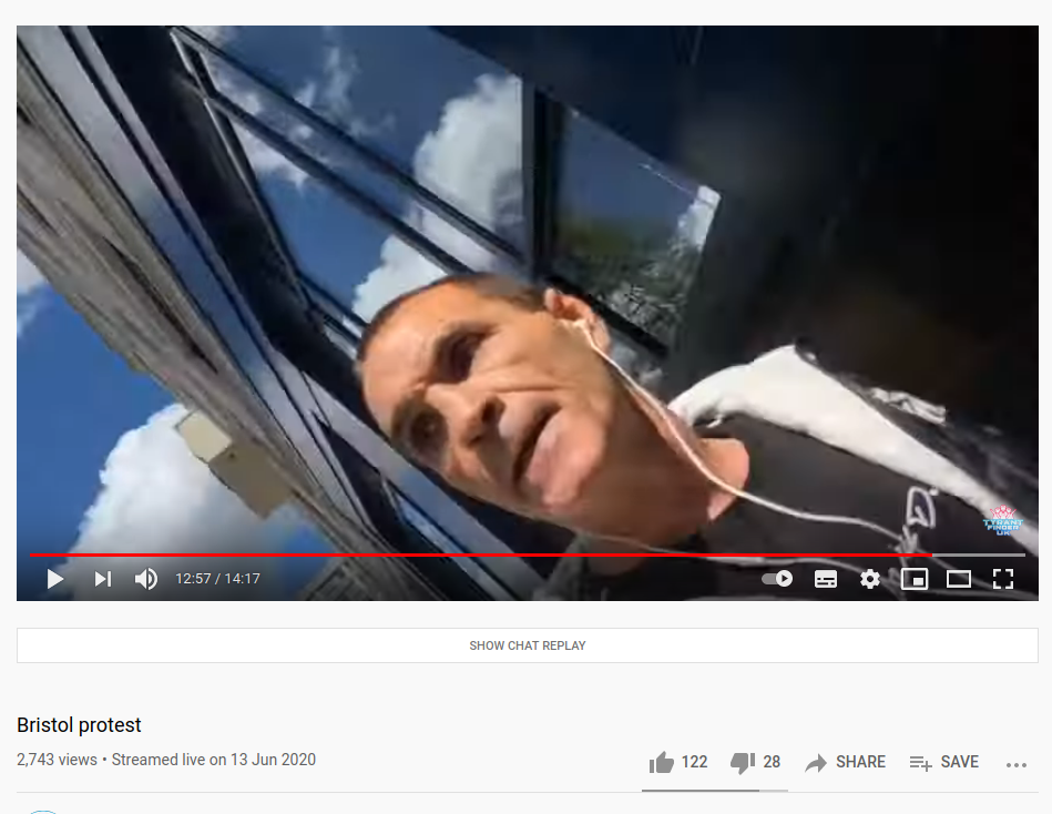 In April 2020, Christopher began to film hospitals and ambulance car parks due to his conspiratorial belief that the pandemic is a hoax and in one video, harassed NHS workers and referred to one as a “Nazi SS officer”. In June, he began filming the protests that exploded in response to the murder of George Floyd, and filmed BLM protests as well as some of the fash counterprotests. While filming on 13 June in Bristol, he was attacked several times by far right protestors who took him to be MSM and threatened to “fucking bury” him – despite telling them “I’m here on your side, I’m with you”.