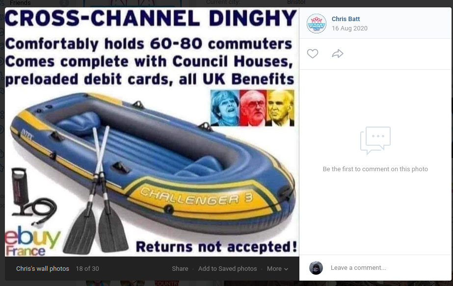 In October 2020, Chris’ voice was recorded as part of a BBC Radio segment which interviewed Steve Laws and ‘Little Boats’ idiot Jeremy Davis, unbeknownst to Chris. During the segment, he was heard describing himself as “the Home Guard” and, quite bizarrely, described his practice of seeking to tail boats and “hold” new arrivals for the coast guard as his “job”. With any arrivals he caught up with, he also admitted to targetting ones that he did not like the look of — “I’ll pick the dodgy one out and say to the coast guard, you have got to watch out for that one”. Chris was particularly pissed off about this recording.