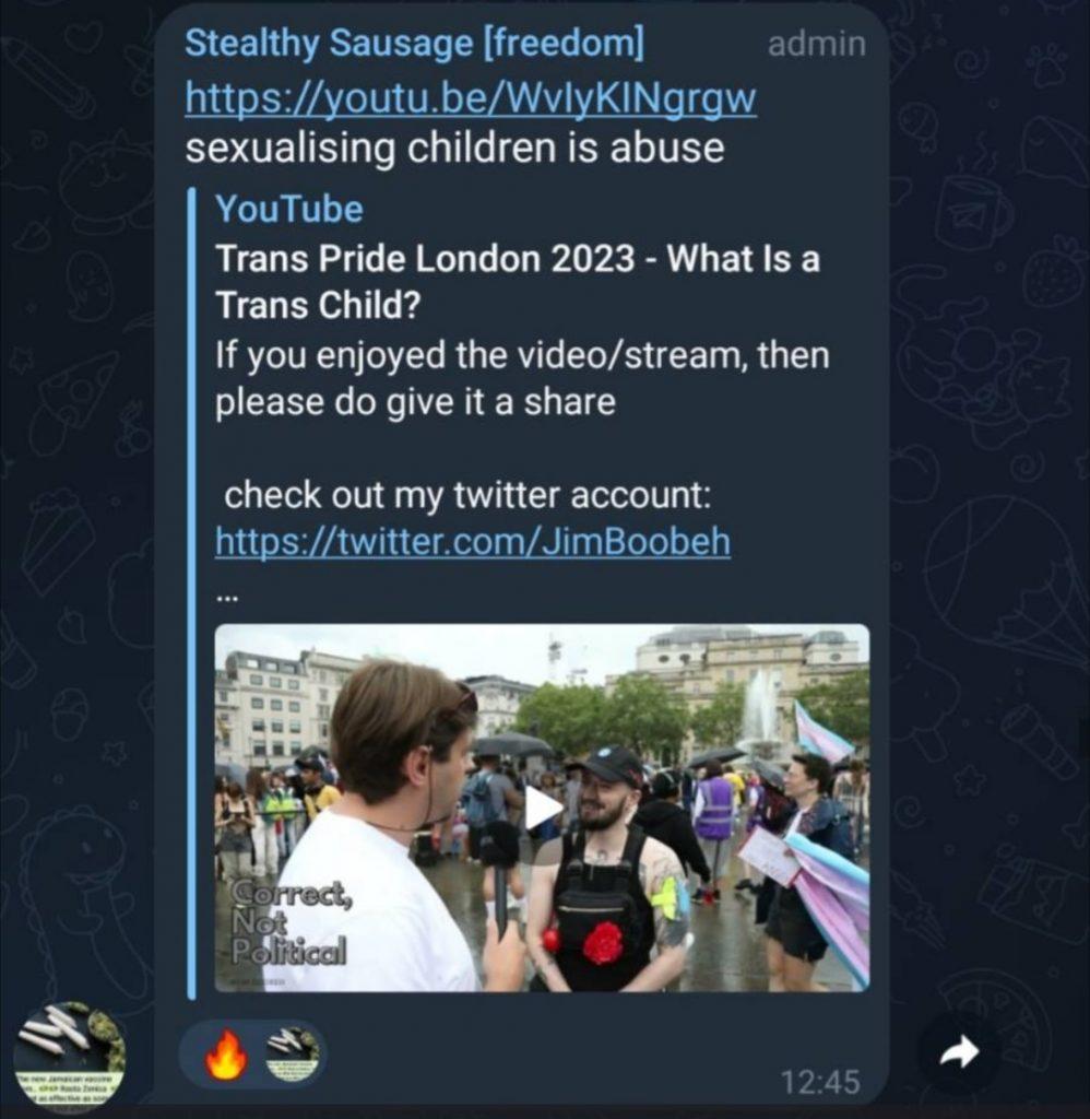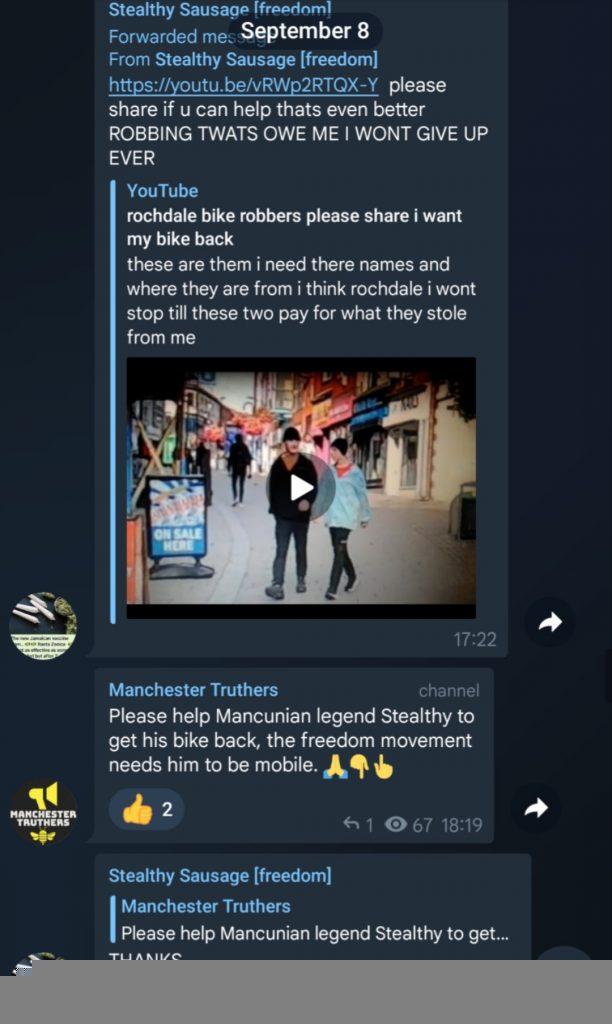 The end of the pandemic has arguably distilled the conspiracy movement: as it lost numbers it became broader in focus and in militancy, while also drawing more in from the far right and its associated milieu. While some conspiracist elements have maintained some sort of opposition to fascism, or at least pretended to (looking at you Students Against Tyranny, we all saw James sharing a stage with Alek Yerbury in Norwich), the North West has had a particular tolerance for the far right, with Drag Queen Story Hour in Bolton last year drawing in members of the North West Infidels and PA, as well as seeing vile literature imported from the US-based antisemitic Goyim Defense League. In light of this, we are pleased to reveal that a key activist in both Manchester and Liverpool conspiracist chats known as “Stealthy Sausage” is Billy Howarth, of Rochdale. Billy heads up Parents Against Grooming, as well as an admin for both the Manchester Truthers and Rochdale 5G Action Telegram chats: truly a cornerstone of the “Freedom” (read: crank) movement in the North West.