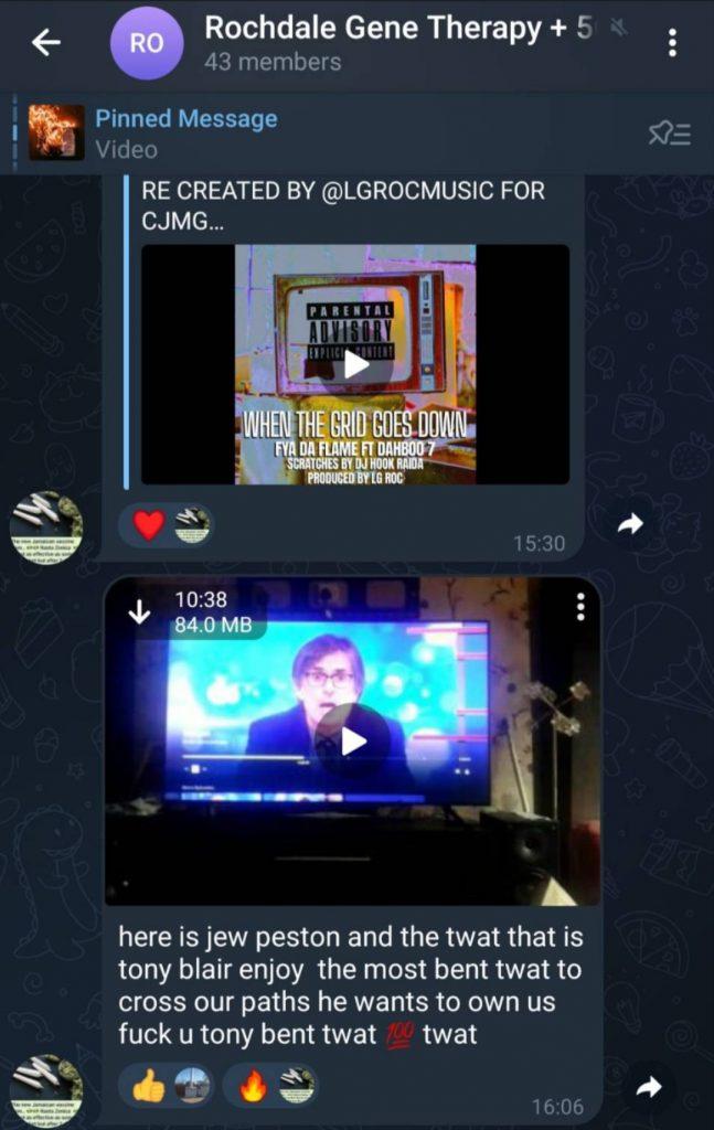 However, where Billy is different from his friends over in the Patriots of Britain and the assorted gammon hooligan groups is again, his tendency to say the quiet part out loud, especially within the confines of the now private Rochdale 5G action group that he leads. Of course, it goes without saying that 99% of the time, the conspiracies pushed by these groups are structurally antisemitic, referring to “them,” the “cabals” with deep and unknowable powers that walk among us all. In the much larger Manchester Truthers chat that he admins, this usually looks something like repeating that “BBC/The Media/ whatever is the virus.” Billy speaks a bit more loosely behind the closed doors of Rochdale 5G Action, getting a hearty round of emoji-based support for referring to Robert Peston as “jew.”